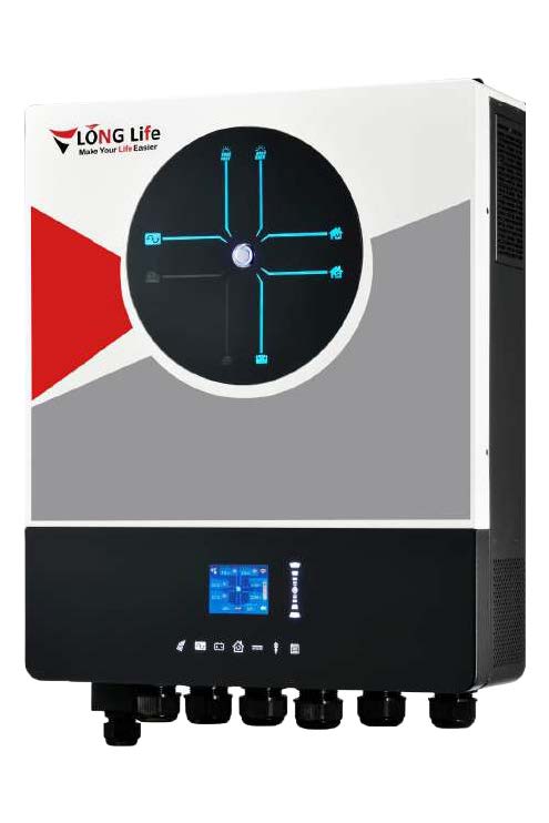 Pure Sine Wave Solar Inverter Big LCD Screen with Richer Content Two Communication Ports for BMS And WIFI Dual AC Output Available For 7KVA RGB Lighting for Different Working Mode Inverter Running With or Without Battery Built-In Lithium Battery Automatic Activation Adjust the Inverter Charging Current According to the Battery Information Internal Clock Function for Showing PV Power Generation and Setting AC Charging Time and Running Loads Time by User Offline Software Upgrade Function Add New F